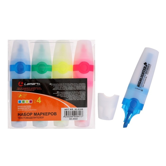 Набор маркеров-текстовыделителей Lamark состоит из четырех цветов маркеров: желтый, розовый, зеленый, синий. Маркеры предназначены для выделения текста на разных типах бумаг. Светоустойчивые быстросохнущие чернила не токсичны, без запаха. Толщина линии 1-5 мм. Клиновидный наконечник. Упакованы в прозрачный пакет с европодвесом.