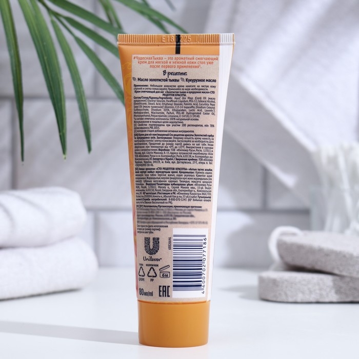 Состав: Aqua, Isopropyl Myristate, Glycerin, Glyceryl Stearate, PEG-12, Zea Mays (Corn) Oil (масло кукурузное), Cetearyl Alcohol, Dimethicone, Cyclopentasiloxane, Cucurbita Pepo Seed Oil (масло тыквенное), Acrylates/C10-30 Alkyl Acrylate Crosspolymer, Butyrosperm.
