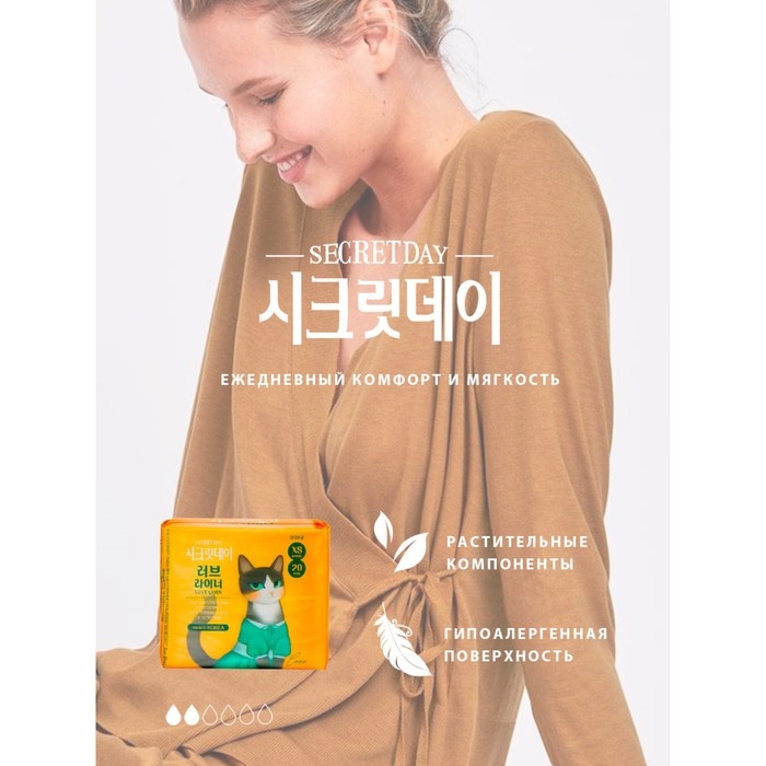 Ультратонкие дышащие ежедневные органические прокладки Secret Day имеют двойной абсорбирующий слой, мягкую гипоаллергенную поверхность из хлопка, которая защитит кожу от трения и произведёт успокаивающий эффект.