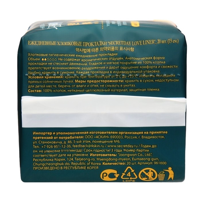 Ультратонкие дышащие ежедневные органические прокладки Secret Day имеют двойной абсорбирующий слой, мягкую гипоаллергенную поверхность из хлопка, которая защитит кожу от трения и произведёт успокаивающий эффект.