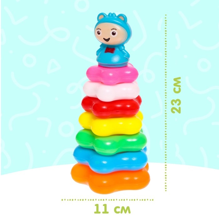 Пирамидка состоит из 7-ми колец, сверху устанавливается яркая игрушка с забавной мордочкой, завершающая конструкцию. Яркий привлекательный дизайн игрушки от ТМ «Крошка Я» обязательно понравится карапузу.