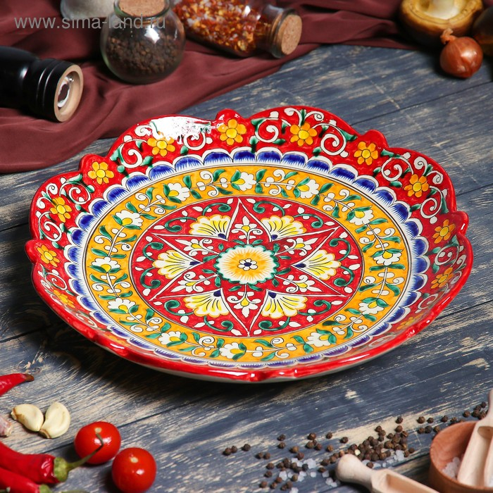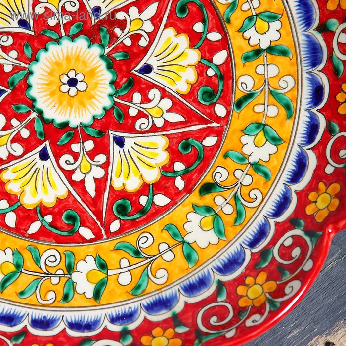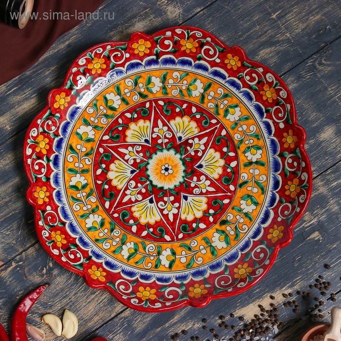 Ляган Риштанская Керамика "Цветы", 32 см, красный, рифлённый