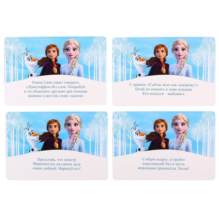 Покружитесь, как будто хотите сотворить снежную бурю! Или поговорите смешным голосом, как олень Свен. Сегодня возможно все! Вытягивайте карточки и выполняйте весёлые задания из набора фантов — вам предстоит отправиться в невероятное приключение вместе с Анной, Эльзой и их друзьями!