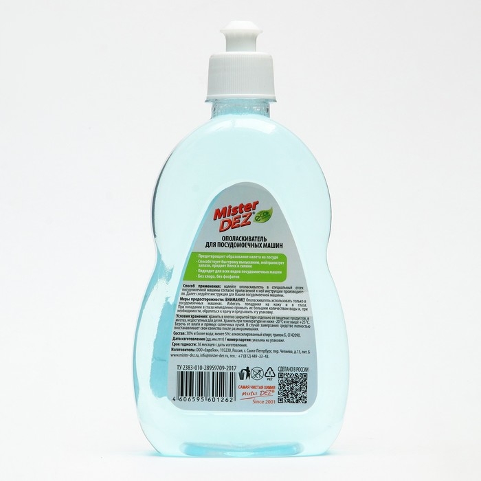 Ополаскиватель для посудомоечной машины Mister Dez эффективно ополаскивает посуду, придает ей блеск, удаляет разводы. Товар сертифицирован.