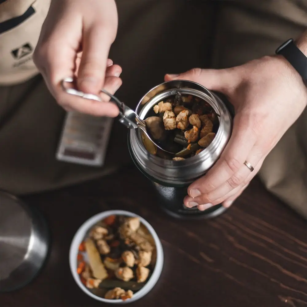 Готовый комплект для похода на природу: термос для еды с широким горлом и ударопрочным покрытием и легкая складная ложка в термочехле.