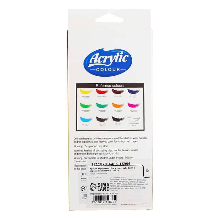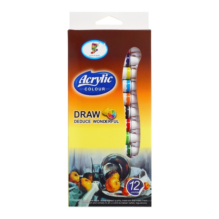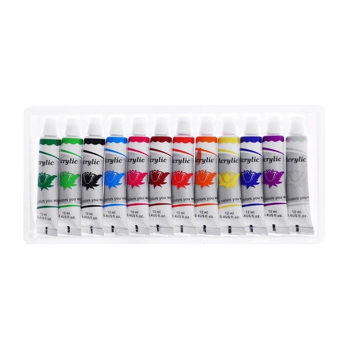 Краски акриловые, 12 цветов, в пластиковой тубе, 12 мл, в картонной коробке