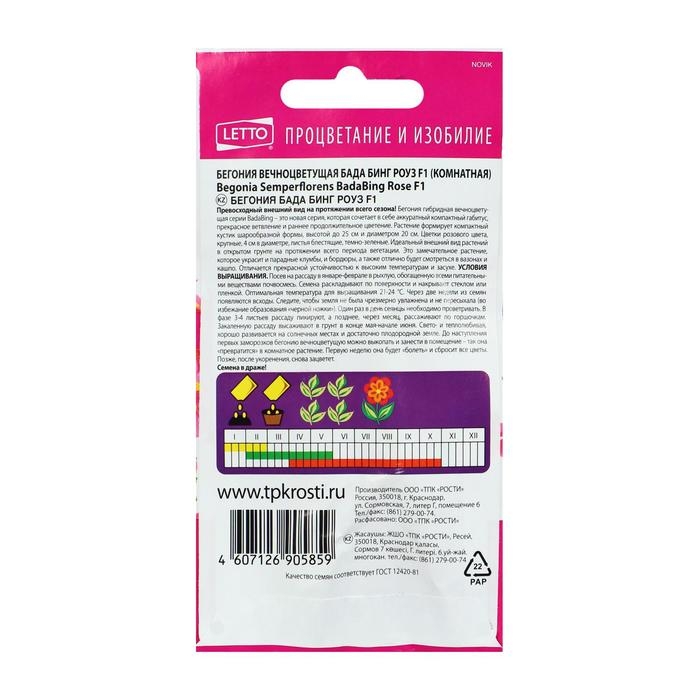 «Бегония Бада Бинг Роуз» — этот вечноцветущий однолетник легко размножаются семенами, которые высеивают на рассаду в конце января — феврале. Подготовленный грунт присыпают слоем чистого песка (3 мм) и хорошо увлажняют. Высота растений: 20–25 см, ширина одного кустика: до 20 см. Цветки довольно крупные, ярких окрасок.