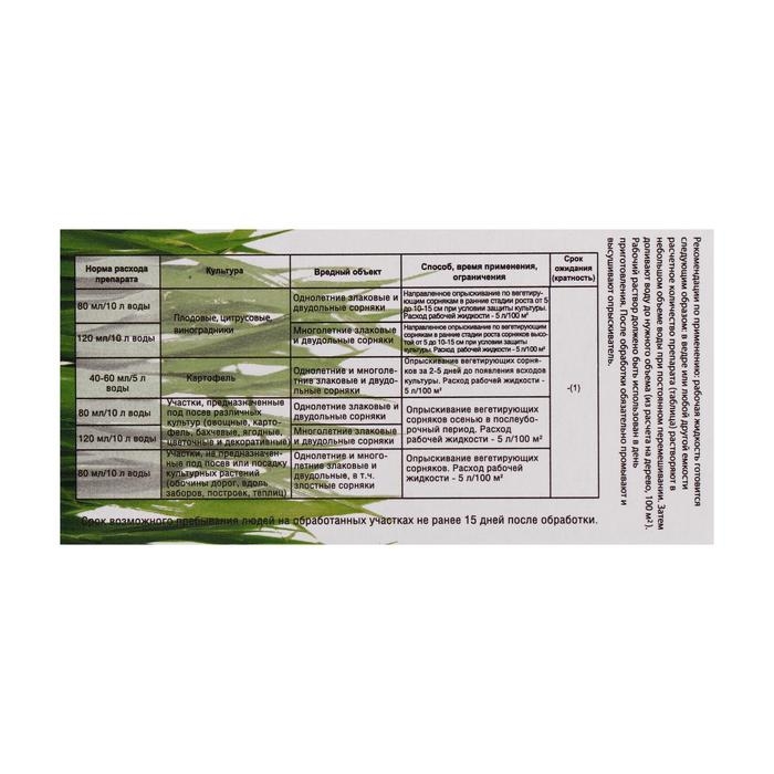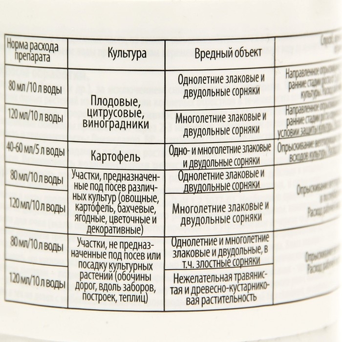 ПРИМЕНЕНИЕ/НОРМА РАСХОДА: - плодовые, цитрусовые культуры, виноградники: однолетние злаковые и двудольные сорняки: 80мл/10л воды; многолетние злаковые и двудольные сорняки:120мл/10л воды, направленное опрыскивание вегетирующих сорняков в ранние стадии роста от 5 до 10-15см при условии защиты культуры, расход - 5л/100м; - картофель: однолетние и многолетние злаковые и двудольные сорняки: 40-60мл/5л воды опрыскивание вегетирующих сорняков за 2-5 дней до появления культуры, расход - 5л/100м2; - участки под посев различных культур: однолетние злаковые и двудольные сорняки: 80мл/10л воды; многолетние злаковые и двудольные сорняки: 120мл/10л воды, опрыскивание вегетирующих сорняков осенью в послеуборочный период, расход - 5л/100м.