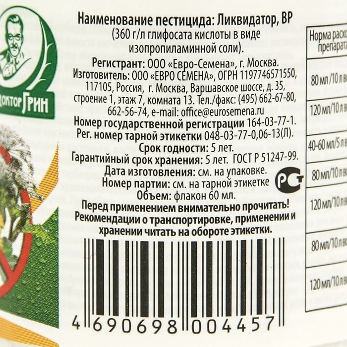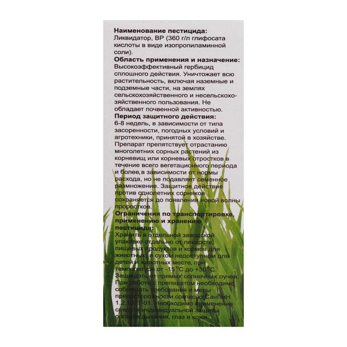 ПРЕПАРАТИВНАЯ ФОРМА: водный раствор. Просто нанесите небольшое количество жидкости на сорняк или борщевик, и уже через несколько дней вы увидите результат. Ваш сад или огород станет чистым и ухоженным, без единого сорняка! Этот продукт содержит специальный состав, который эффективно уничтожает сорняки, не повреждая при этом другие растения. Благодаря своей концентрированной формуле, Ликвидатор обладает мощным действием и гарантирует быстрый результат. Не теряйте время на прополку и борьбу с сорняками вручную - приобретите средство Ликвидатор и наслаждайтесь красивым и ухоженным садом без лишних усилий. Защитите свои растения от нежелательных гостей с помощью этого эффективного средства!