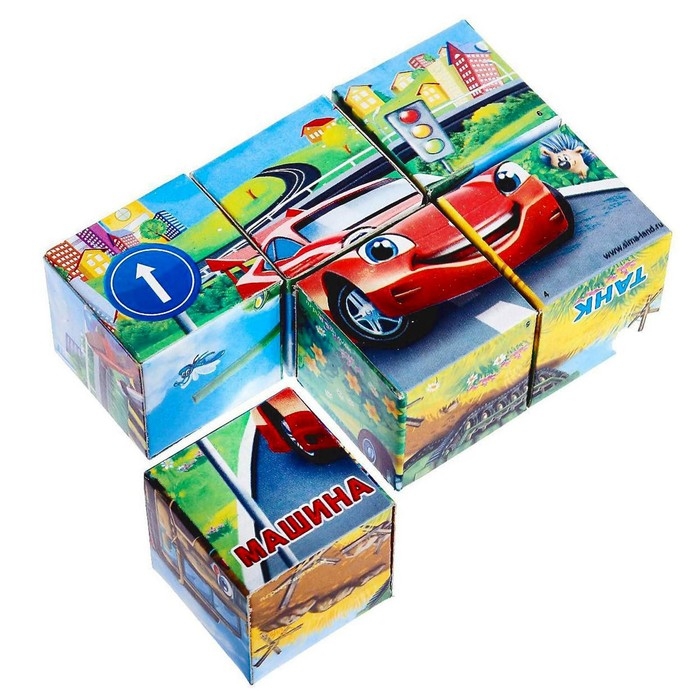 На каждой грани кубиков вы найдёте часть яркой иллюстрации с одним из видов транспорта. Из кубиков можно сложить шесть картинок. Здесь есть и стремительный самолёт, и быстрая машина, и скоростной мотоцикл!