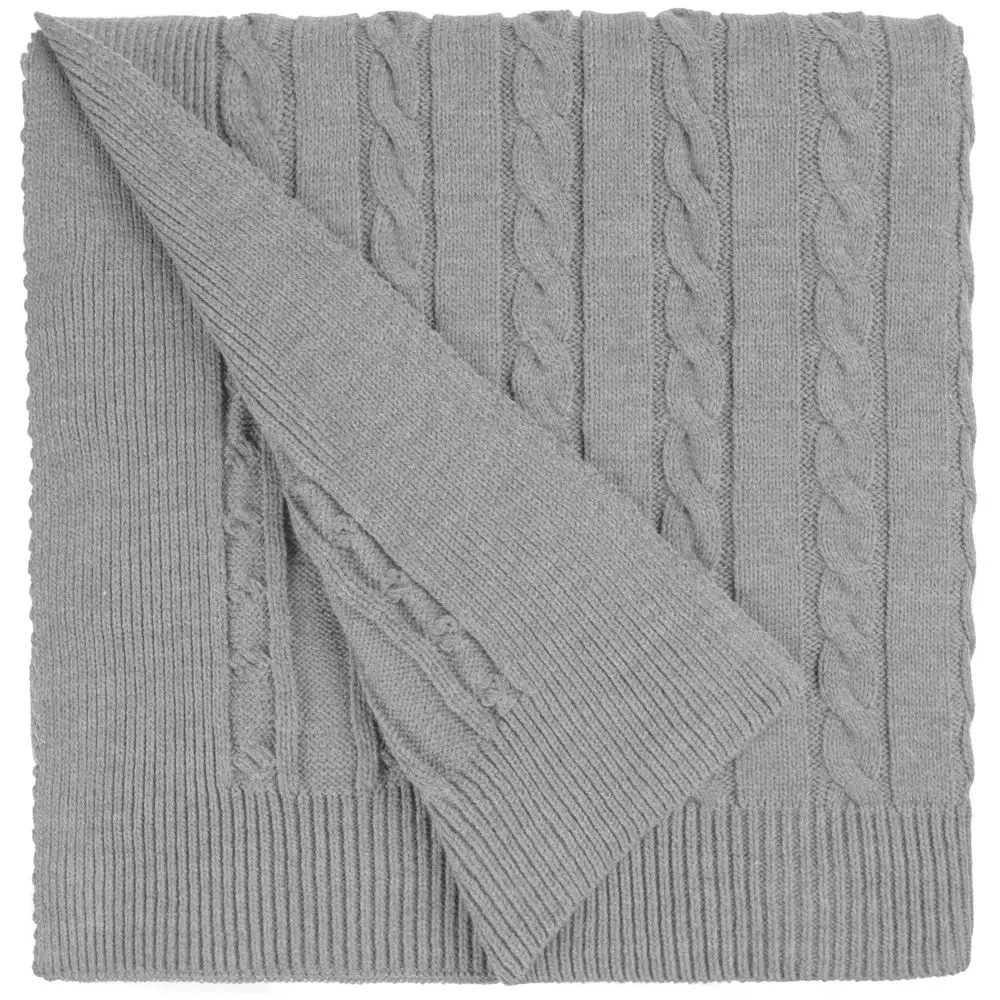 Модель: однотонный плед с фактурной вязкой, которая позволяет сделать его воздушным и объемным. Чередуя различные типы петель на гладком полотне, можно вывязать любую графику — логотип, текст, товарный знак.