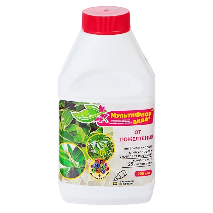 «Мультифлор Аква» — комплексное минеральное удобрение с микроэлементами и гуминовыми кислотами для подкормки комнатных и балконных растений в зависимости от пожелтения листьев.