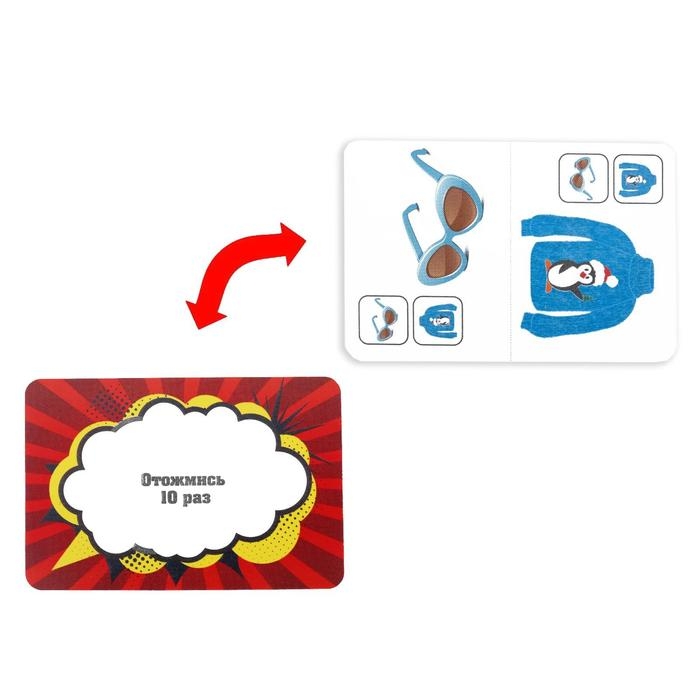 Перед началом игры каждый участник получает по 7 карт, а на стол выкладывается от 1 до 4 (в зависимости от количества игроков). Каждая карточка делится на две части. В итоге получаются две картинки. Посмотрев на изображения, участники сбрасывают совпадающие с ними карты. Смотрите внимательнее, действуйте быстрее и не забывайте про специальные обозначения. А первый, кто избавится от своих карт, и будет победителем!