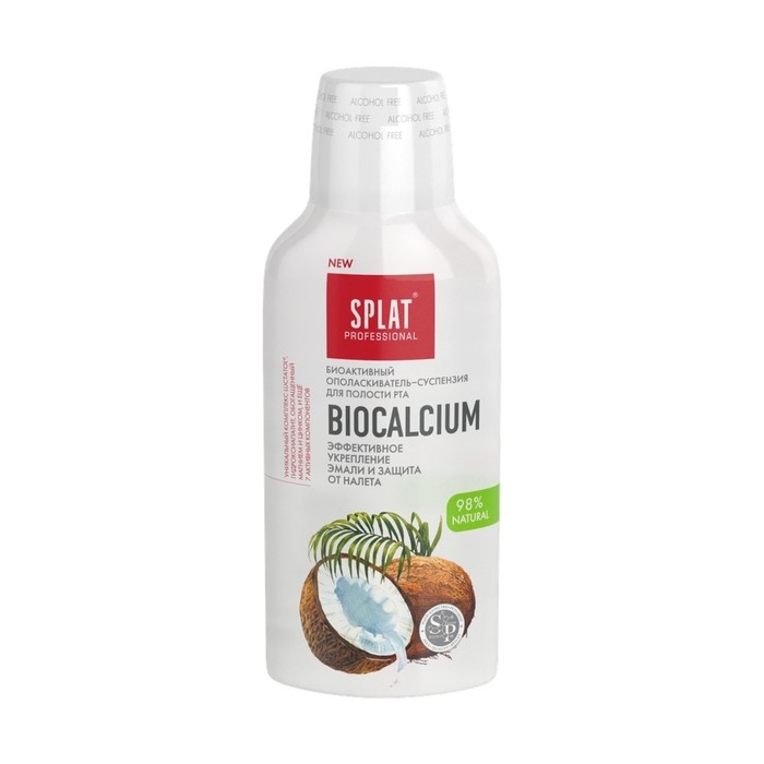 Ополаскиватель для полости рта SPLAT Professional BIOCALCIUM (БИОКАЛЬЦИЙ) со вкусом кокоса разработан для защиты от налета и укрепления эмали. Входящий в состав комплекс BIO Sp.White® Mouthwash из фермента бромелайн и лизатов бифидобактерий осветляет эмаль и нормализует микробиоту в полости рта. Уникальный комплекс LUCTATOL® сокращает риск образования кариеса и предотвращает появление зубного налета на 96%. Обогащенный магнием и цинком гидроксиапатит и лактат кальция способствуют реминерализации эмали. Натуральные масла лимона и аниса обладают противовоспалительным действием. Клинически доказанная эффективность за 4 недели применения.