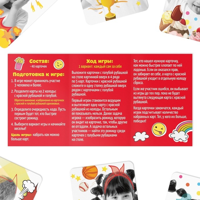 В коробке вы найдёте 2 колоды из больших и маленьких карточек. Картинки на них одинаковые. Маленькие выложите рубашкой вниз, а рядом положите колоду из больших. По очереди вытягивайте карты и изображайте нарисованные на них рожицы. Тот, кто быстрее найдёт их среди маленьких карточек, получает баллы. Победит самый внимательный!