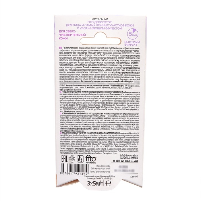 Способ применения: Нанесите крем на кожу сплошным равномерным слоем так, чтобы все волоски были полностью покрыты. Оставьте крем на 5-7 мин, затем удалите его вместе с волосками ватным диском, тщательно ополосните кожу водой.