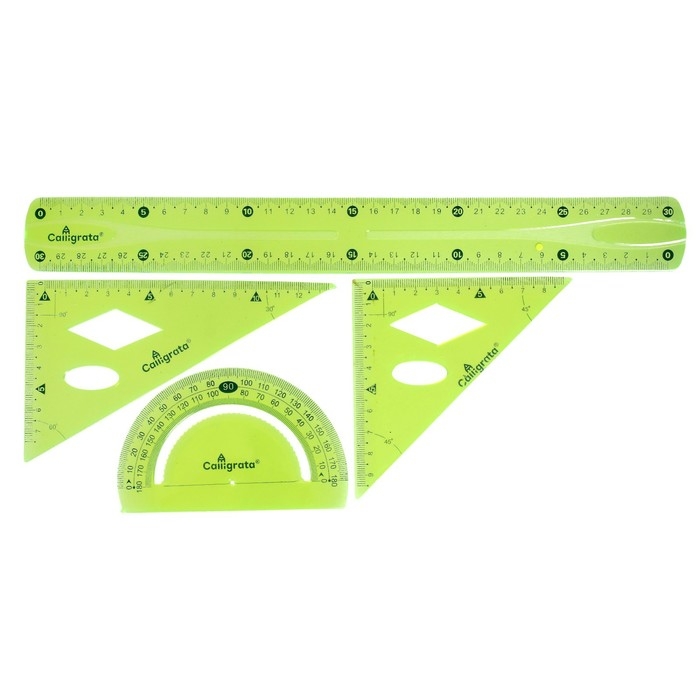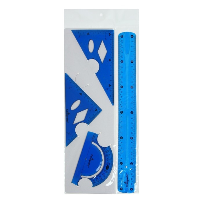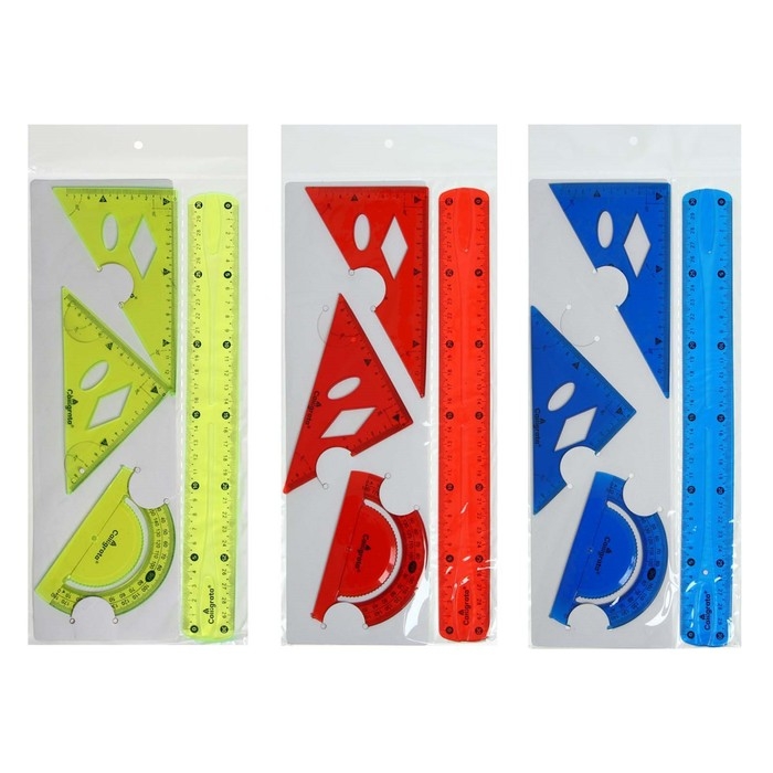 В комплекте: линейка 30 см, 2 угольника, транспортир.