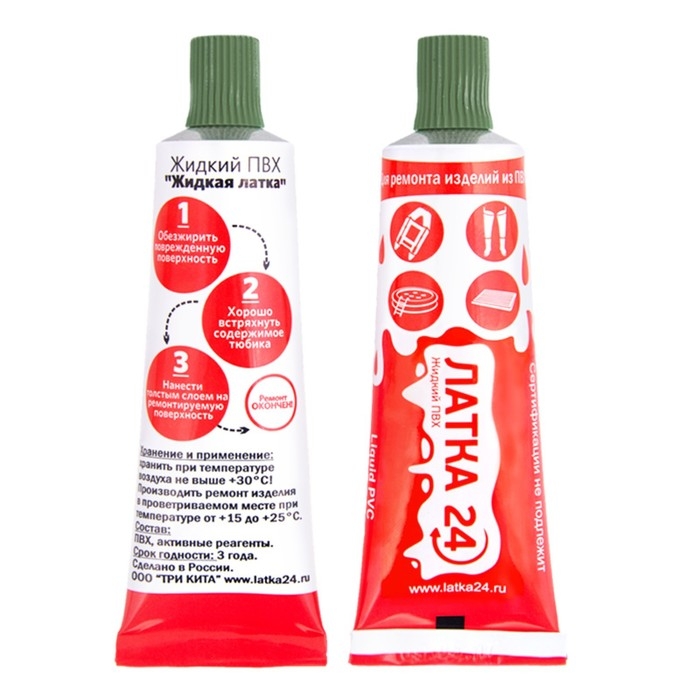 Жидкая "Латка 24" - инновационный продукт для ремонта изделий из ПВХ, неопрена, триламината. Обладает рядом преимуществ, что позволяет сделать ремонт полученного дефекта ПВХ материала максимально качественным и надёжным. Подходит для ремонта лодок, бассейнов, обуви, тентов, палаток и других ПВХ изделий.