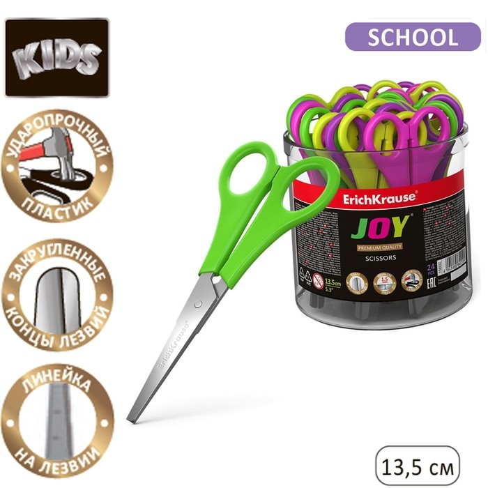 Ножницы детские 13,5 см, ErichKrause Joy, в стакане, с закруглёнными концами лезвий и линейкой, МИКС (цена за 1 штуку)