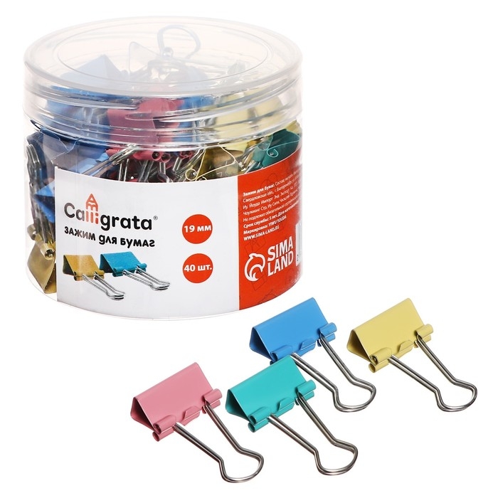 Набор зажимов для бумаг, цветные, 19 мм, 40 штук, 4 цвета, в пластиковой тубе, МИКС, CALLIGRATA