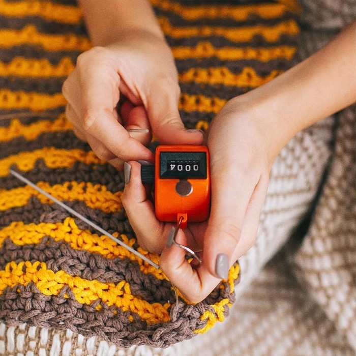 Не запутаться в готовых рядах поможет специальный счётчик. Он надевается на спицу или нитку, и при окончании последовательности вам нужно повернуть колёсико, чтобы обновить цифру. Такая система позволит спокойно откладывать вязание, если вам срочно нужно заняться другими делами.