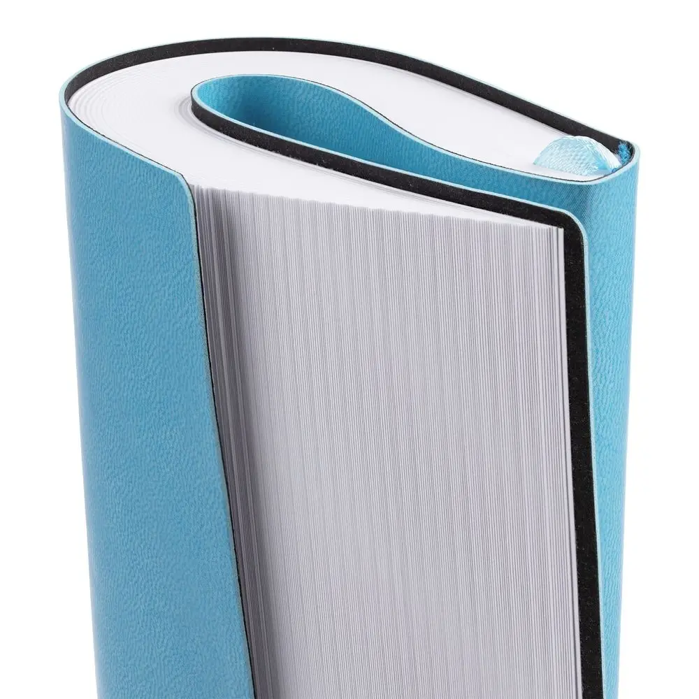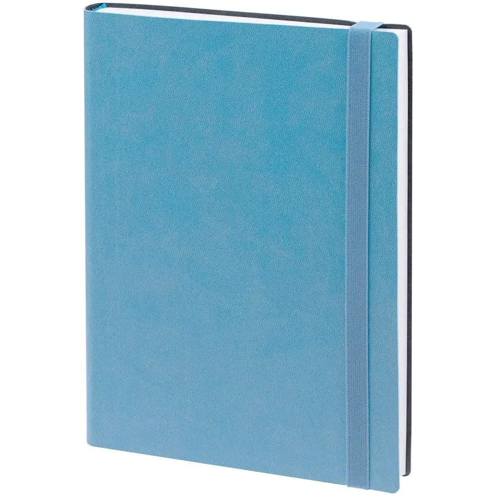 Ежедневник с гибкой обложкой выполнен из материала Latte, голубой JJ, и дополнен резинкой шириной 1 см, капталом и ляссе голубого цвета.