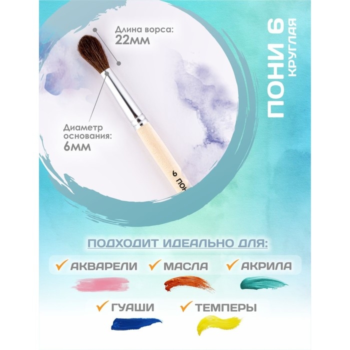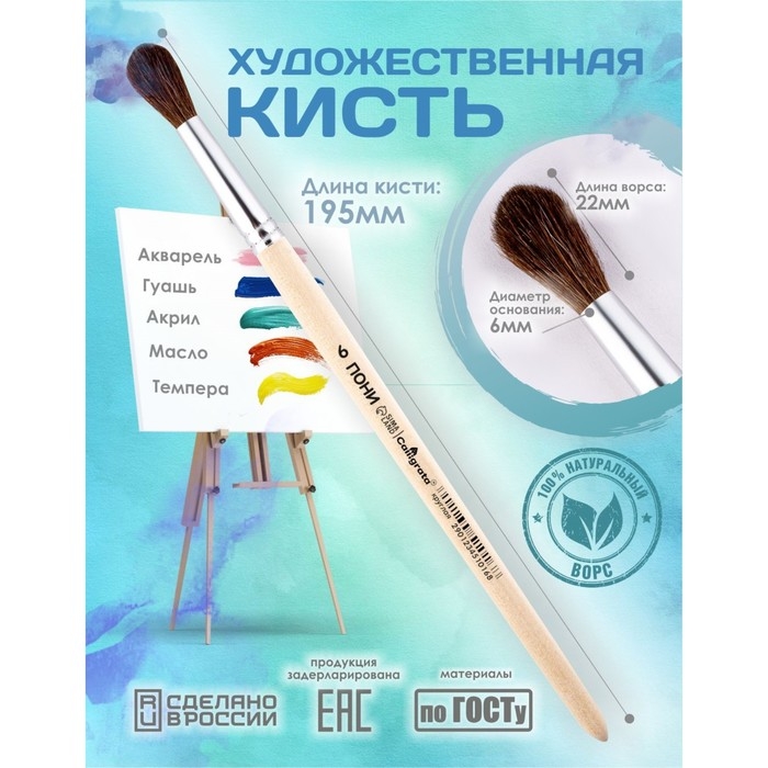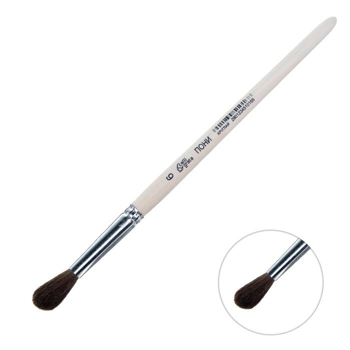Кисть для рисования, Пони круглая № 6 (диаметр обоймы 6 мм; длина волоса 22 мм), деревянная ручка, Calligrata