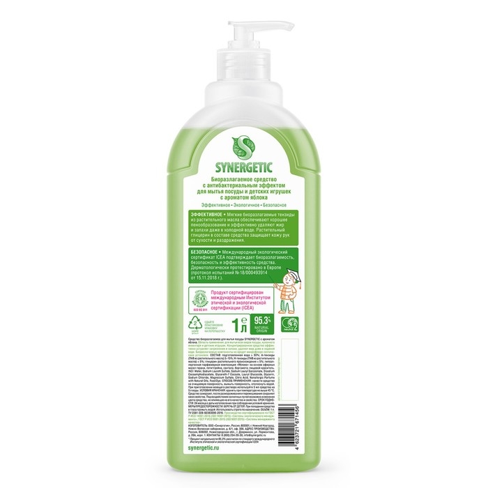 Средство для мытья посуды Synergetic "Яблоко", с антибактериальным эффектом, 1 л