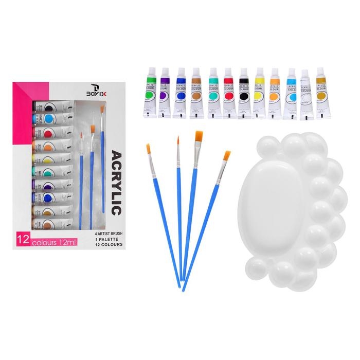 Краски акриловые, 12 цветов в пластиковой тубе, 12 мл, в картонной коробке, 4 кисти, палитра