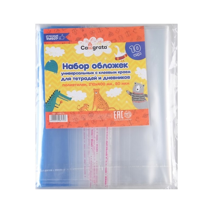 Набор обложек ПЭ 10 штук, 210 х 400 мм, 80 мкм, для тетрадей и дневников (в мягкой обложке), с клеевым краем