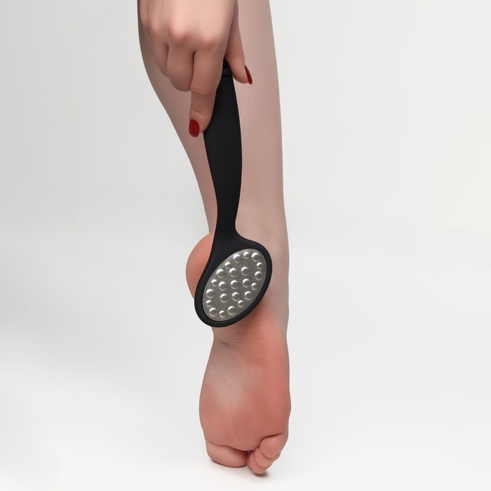 За счёт дизайна, тёркой могут пользоваться не только женщины, но и мужчины. На металлической поверхности с помощью лазера сделаны микрозубчики, которые за 10 пропилов снимут 1 мм огрубевшей кожи. Другая сторона тёрки отполирует уже подготовленный участок до идеального состояния. Проводить такую процедуру можно как на распаренной коже ног, так и на сухой. Комфортную эксплуатацию педикюрного инструмента обеспечит длинная ручка. Между подходами нужно промывать рабочую область в тёплой воде.