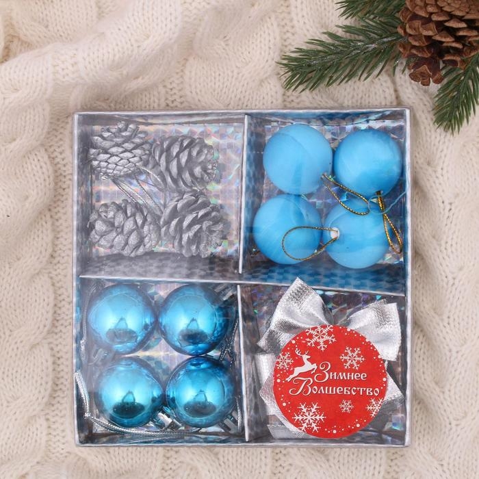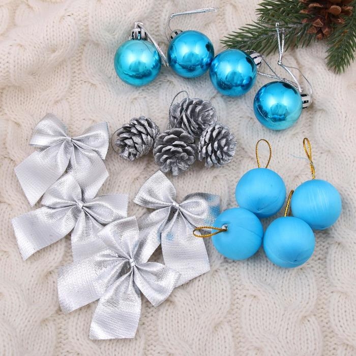 Набор украшений пластик 16 шт "Карнавал" (4 бантика,4 шишки,8 шаров) серебро, голубой