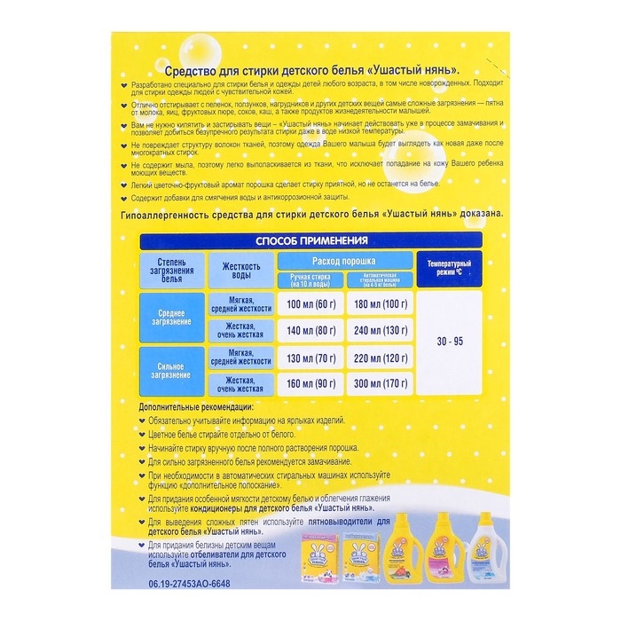 Стиральный порошок «Ушастый нянь» специально разработан для чистки белья и одежды детей любого возраста, в том числе и новорождённых.