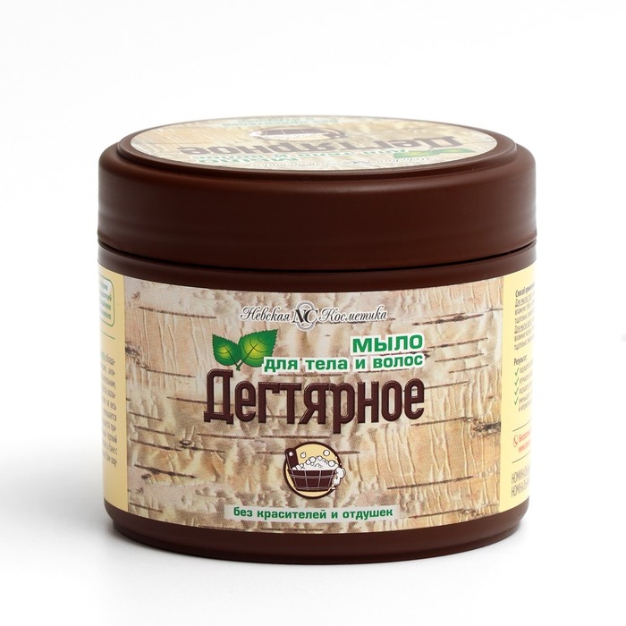 Дегтярное мыло «Невская косметика» сочетает в себе 2 средства: гель для душа и шампунь. Мягкая и нежная пена бережно очищает, при этом не вызывает сухости и раздражения. Входящий в состав натуральный берёзовый дёготь эффективно восстанавливает и успокаивает пряди и кожу головы.