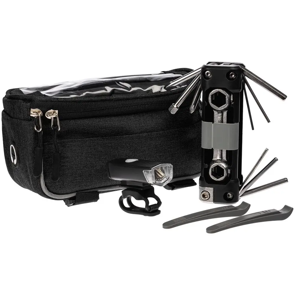 В этот набор входит все, что может понадобиться велосипедисту на вечерней прогулке: вместительная сумка для телефона и необходимых мелочей, мультитул, включающий в себя инструменты для обслуживания велосипеда, и фонарь, который не даст сбиться с пути в темное время суток.