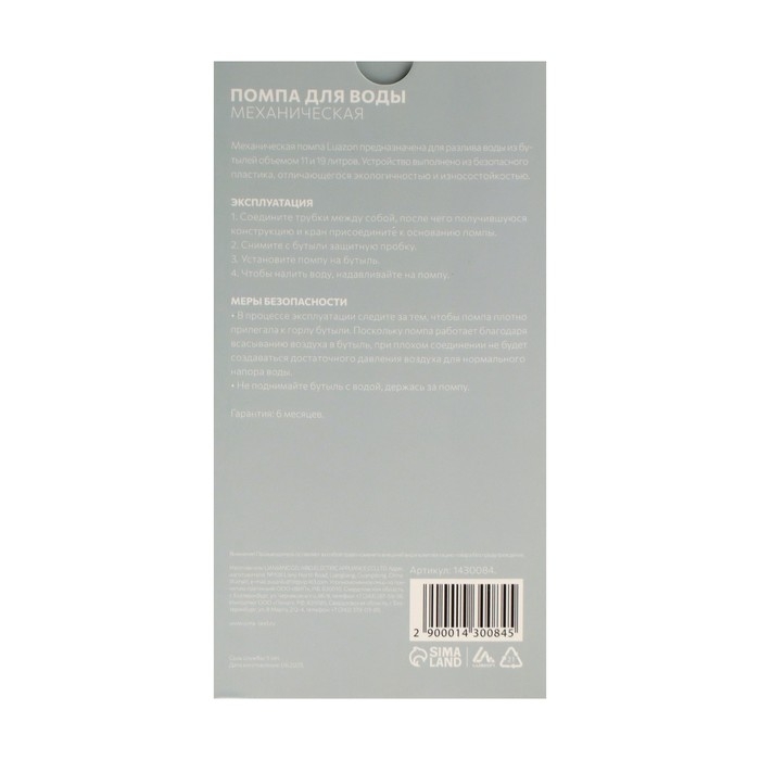 Помпа для воды Luazon, механическая, малая, под бутыль от 11 до 19 л, голубая