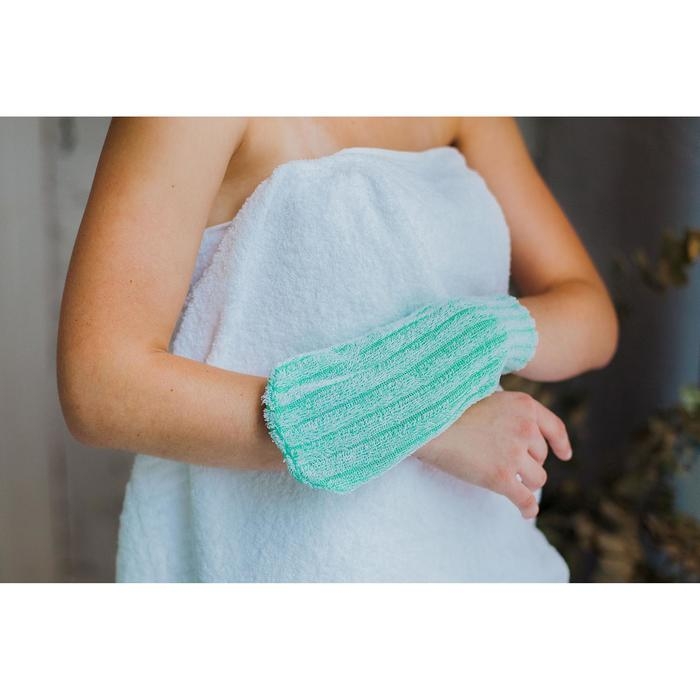 Изготавливается варежка из натурального материала, который проходит обработку в несколько этапов. Она отличается жёсткостью и шероховатостью, благодаря чему глубоко отшелушивает эпидермис.