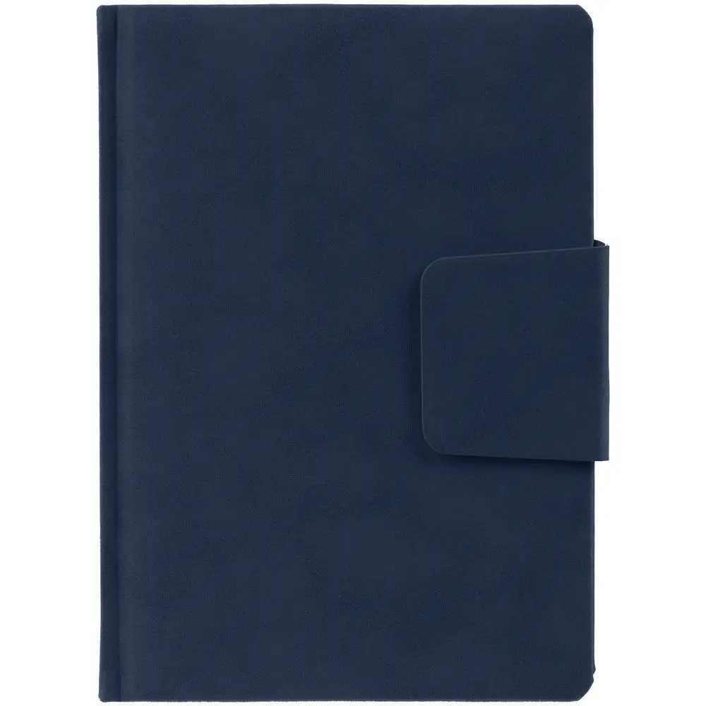 Ежедневник с твердой обложкой c поролоном, выполнен из материала Nubuck, темно-синий ХХ, дополнен капталом и ляссе темно-синего цвета. Застежка — хлястик на магните.