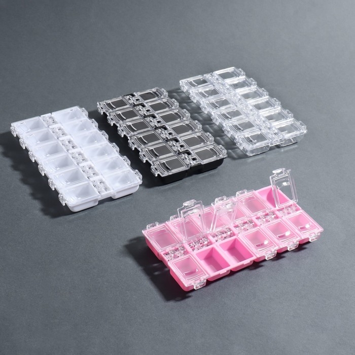 Этот компактный органайзер — настоящая находка для тех, кто ценит порядок и удобство. Благодаря 12 секциям он идеально подойдет для хранения мелочей, таких как декор для маникюра, стразы, фимо и другие аксессуары. Пластиковая конструкция обеспечивает лёгкость и долговечность, а плотная прозрачная крышка позволяет быстро находить нужные предметы, защищая их от высыпания и перемешивания.