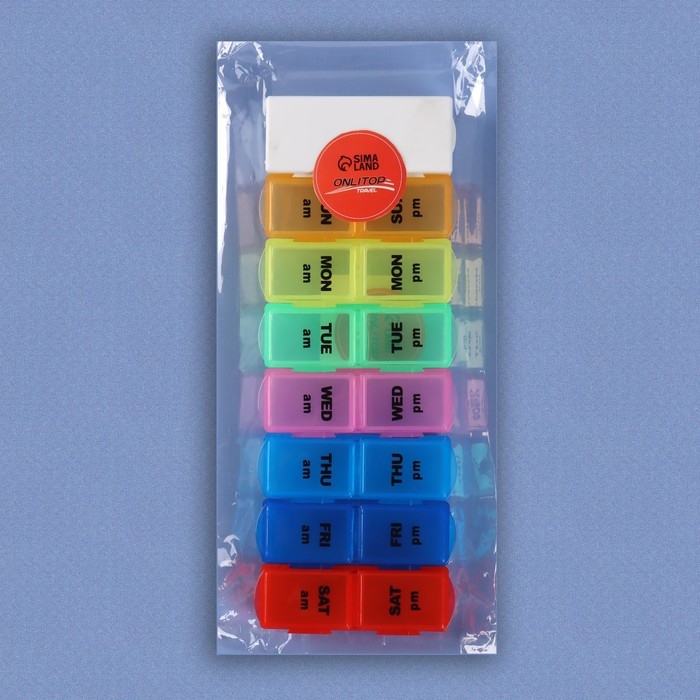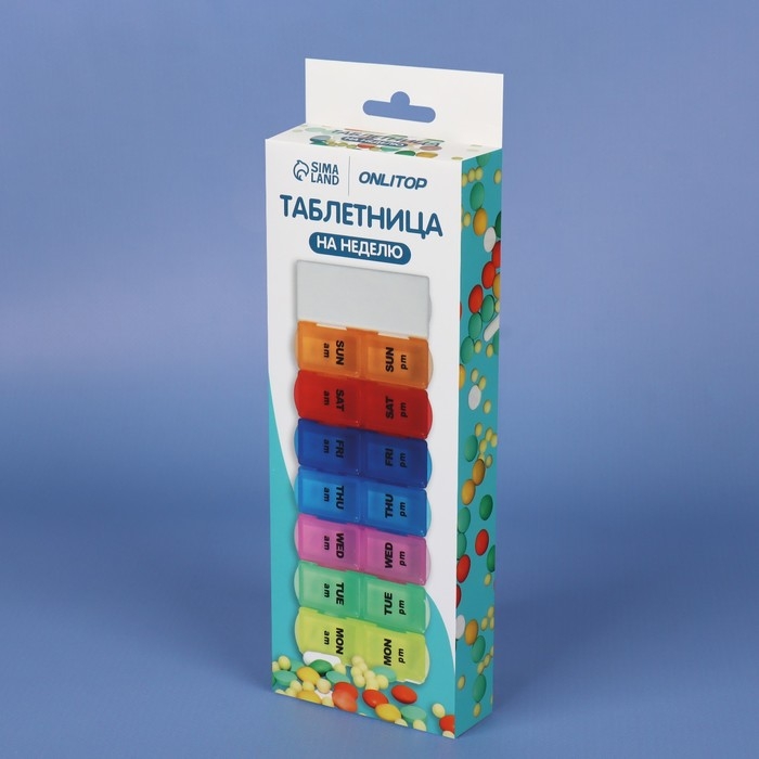 Таблетница - органайзер «Неделька», английские буквы, утро/день/ночь, 21,5 × 11 × 2 см, 21 секция, разноцветная