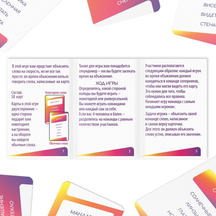 Задача игрока — объяснить своей команде слово, написанное в самом верху карты. При этом нельзя называть его, использовать однокоренные или те, что написаны на карточке. Чем больше слов вам удалось объяснить, тем больше очков вы получите!