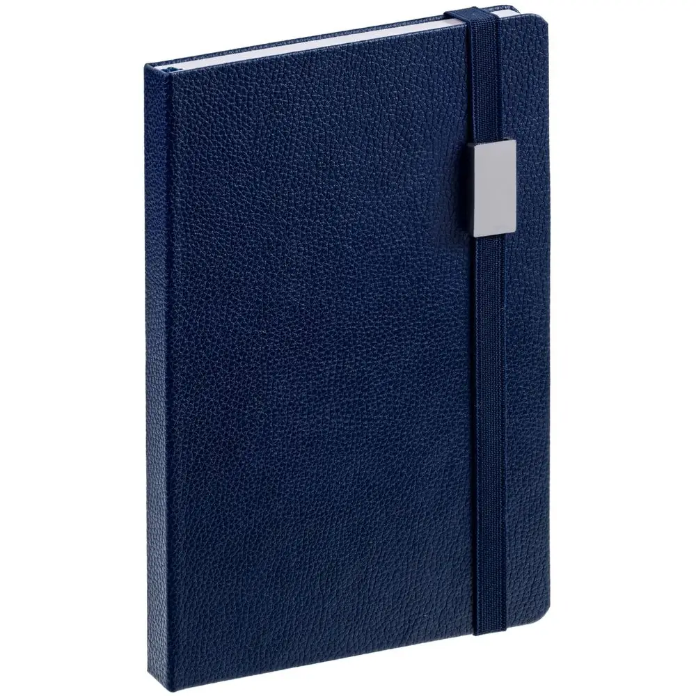 Зауженный ежедневник с прямоугольным металлическим шильдом на резинке.