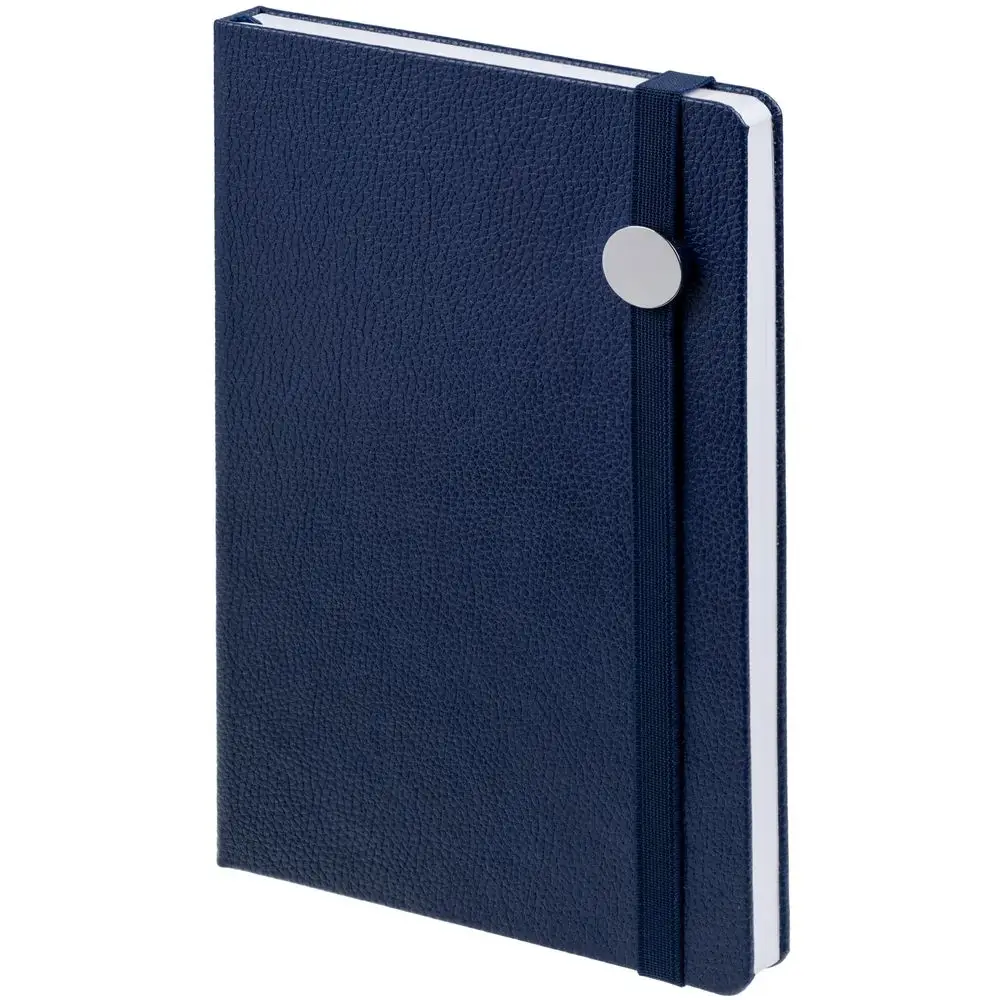 Зауженный ежедневник с круглым металлическим шильдом на резинке.