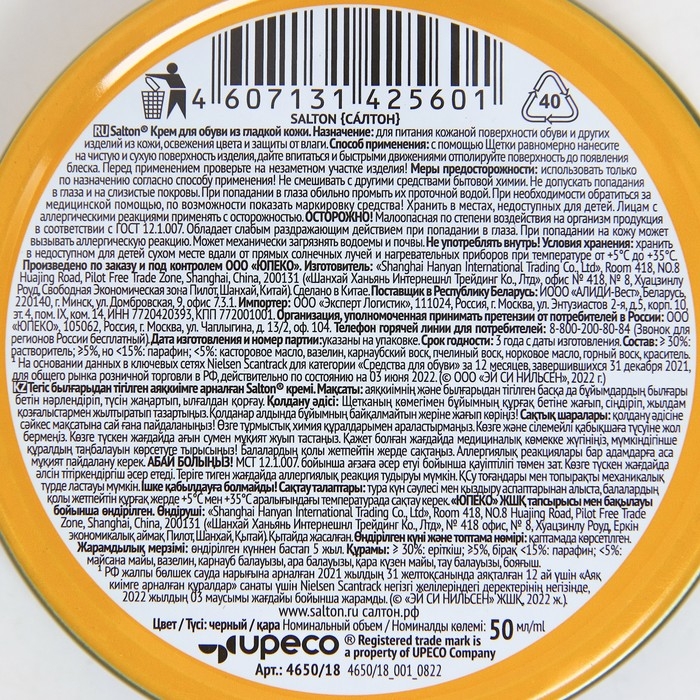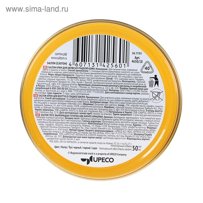 Благодаря инновационной Технологии All-Day-Effect Крем для обуви SALTON поддерживает ухоженный вид обуви в течение всего дня: предотвращает появление мелких трещин, восстанавливает цвет, придает интенсивный блеск после полировки, обладая водоотталкивающими свойствами.