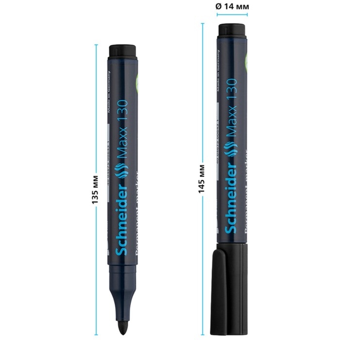 Перманентный маркер Schneider Maxx 130 с чернилами чёрного цвета на спиртовой основе предназначен для письма на большинстве твёрдых поверхностей, включая картон, бумагу, металл, стекло, дерево и пластик. Круглый корпус маркера диаметром 14 мм выполнен из пластика. Маркер представлен с пулевидным наконечником, толщина линии составляет 3 мм. Изделия со стойкими чернилами могут находиться без колпачка до 3 дней и не высыхают.