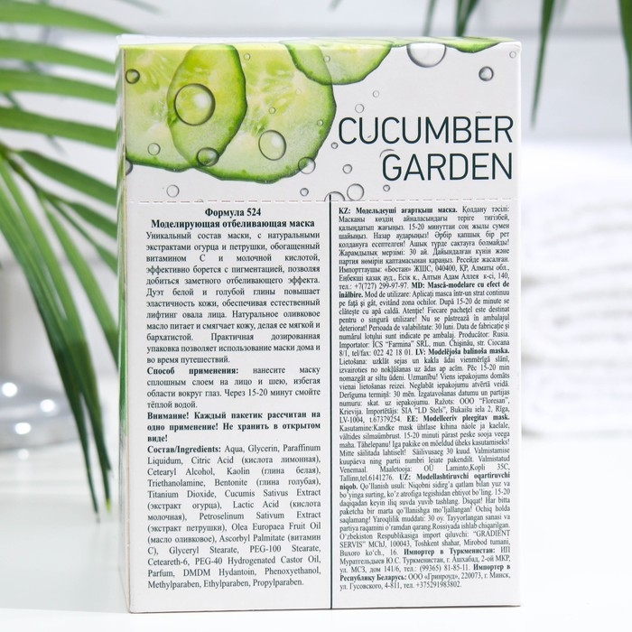 Уникальный состав маски, с натуральными экстрактами огурца и петрушки, обогащенный витамином С и молочной кислотой, эффективно борется с пигментацией, позволяя добиться заметного отбеливающего эффекта. Экстракт золотого корня омолаживает и тонизирует кожу. Дуэт белой и голубой глины повышает эластичность кожи, обеспечивая естественный лифтинг овала лица. Натуральное оливковое масло питает и смягчает кожу, делая ее мягкой и бархатистой. Практичная дозированная упаковка позволяет использование маски дома и во время путешествий.