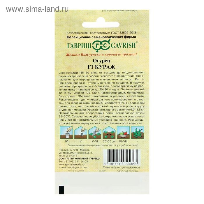 Семена Огурец "Кураж" F1, скороспелый, партенокарпический, 10 шт.