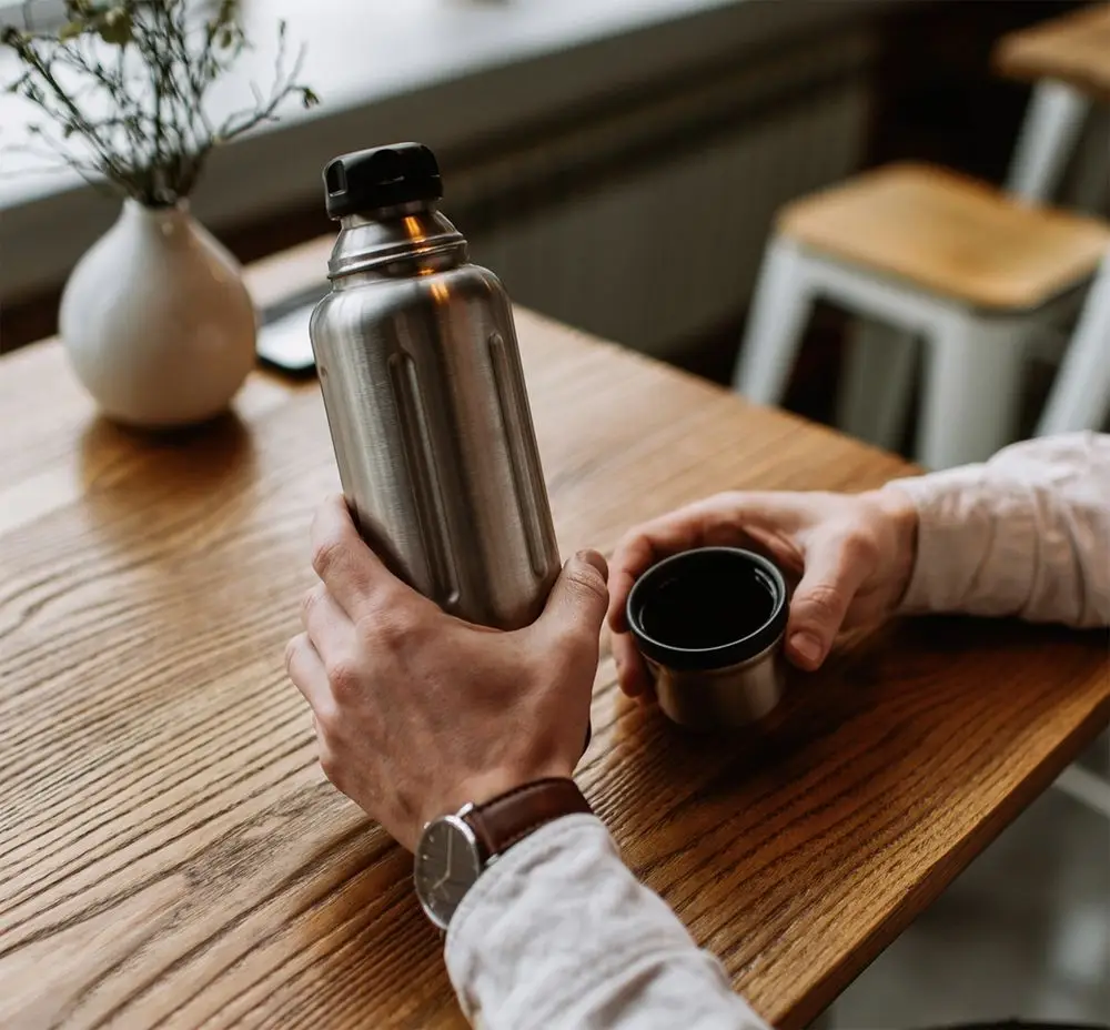 - Узкое горлышко минимизирует теплопотери, а благодаря металлу на пробке напиток не контактирует с пластиком
