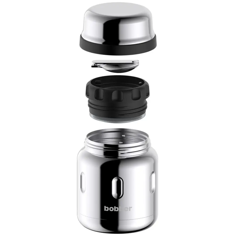 Стальной вакуумный термос для еды со складной ложкой. В нем любимые блюда не соприкасаются с пластиком и остаются горячими надолго.