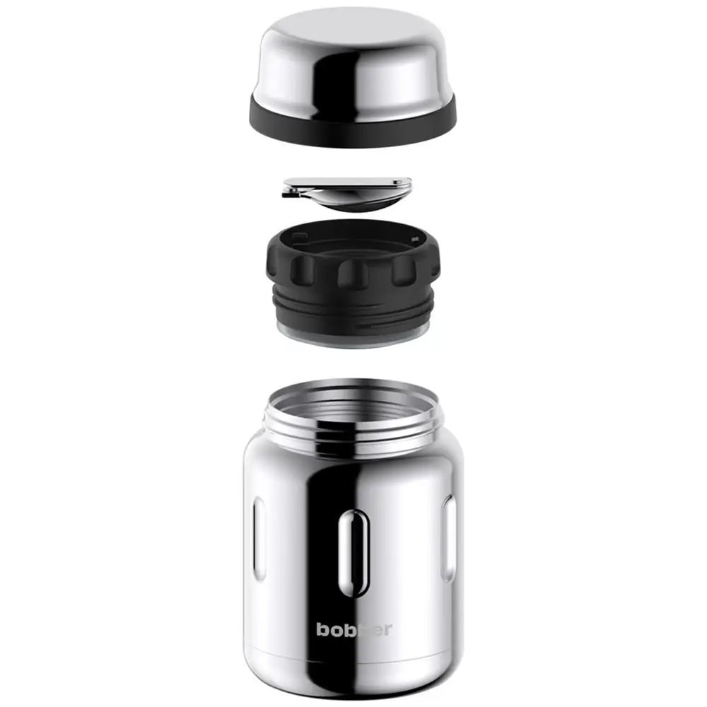 Стальной вакуумный термос для еды со складной ложкой. В нем любимые блюда не соприкасаются с пластиком и остаются горячими надолго.